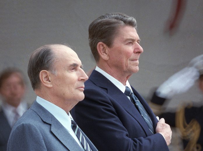 President Ronald Reagan with French President Mitterrand at wreath-laying ceremony at the American cemetery at Omaha Beach in 1984. Department of Defense photo by SPC 5 James Cavalier.