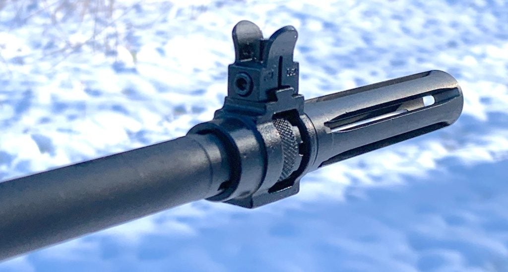 The handguard (above), front sight, and flash suppressor