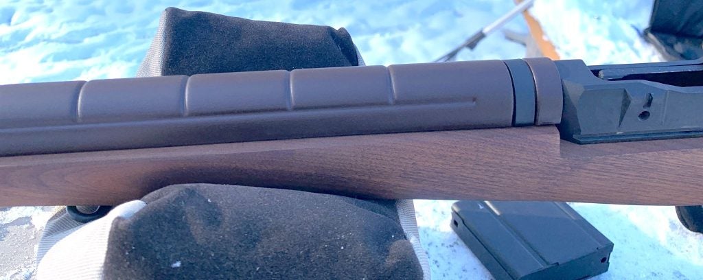 By way of one excuse, he kept having condensation form in the aperture ring, so he couldn’t get a really sharp front sight image. As I said, this rifle will cut the mustard… he and I just don’t do so well in Indiana winter conditions!