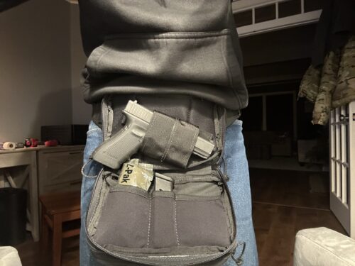 The fit small items nicely. The QRF utilizes a 1.5-inch SecureStretch belt to go around any 26″–46″ waist, and is designed to stay stable during movement like walking or climbing. Dual-adjust buckles and angled belt anchors help reduce bounce. You can joke with your weapon, and gear in it. It won’t bounce if you cinch it around your waist snugly.
